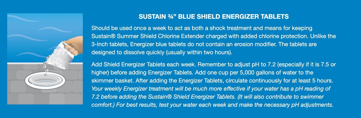Routine use of Sustain 3/4-inch blue Shield Energizer Tablets not only provides shocking protection, but also routinely recharges Summer Shield Chlorine Extender with chlorine.
